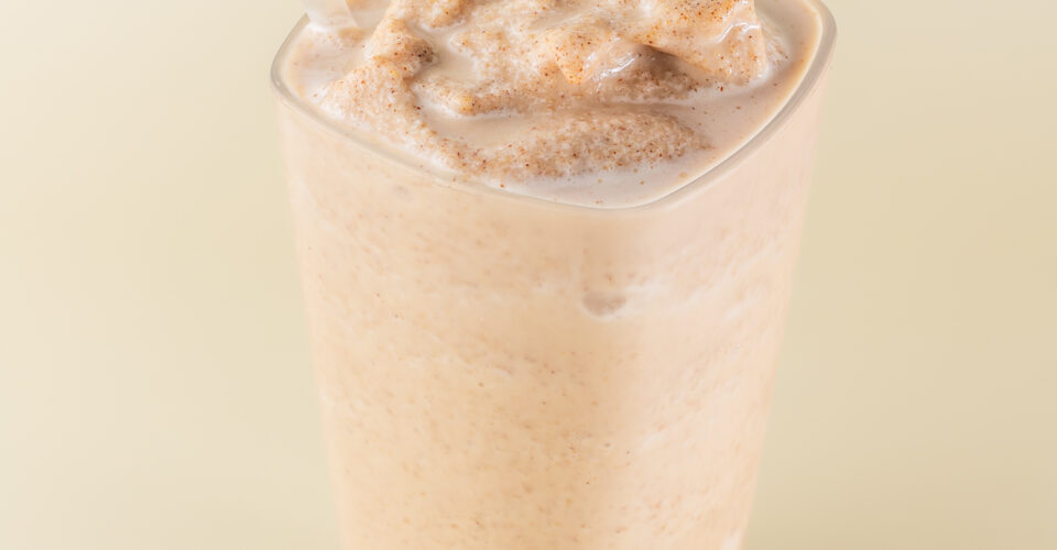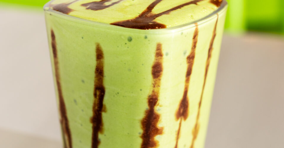 Vanilla whey protein, avocado, flax seed, spinach, plant based pistachio extract, vegan chocolate sauce, organic agave nectar.