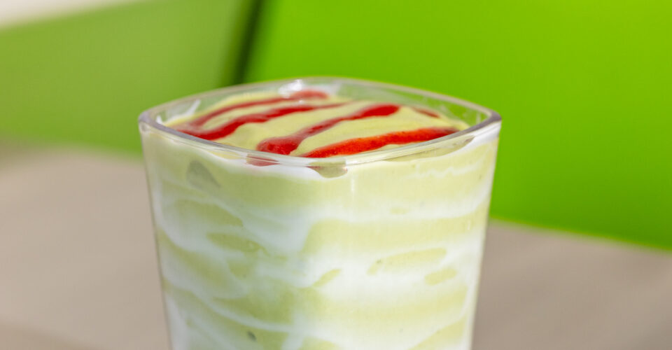 Strawberry Sauce, Collagen, Non-Fat Yogurt, Vanilla Whey Protein, Honey, Banana, Ceremonial-Grade Matcha, Avocado.
